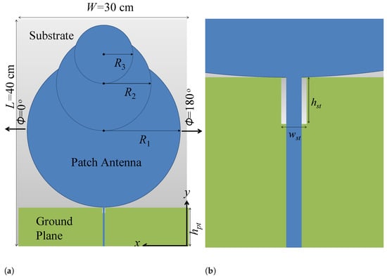 The patch is formed by circles that are centered on the borders of smaller circles. The ratio of the radius of any circle to its immediately smaller circle is given by the golden ratio = 1.618. The geometric parameters of the proposed antenna are indicated in Figure 11. For the preliminary antenna model, the geometric parameters are = 57 mm, = 10 mm, = 6 mm, = 140 mm, = /= 86.52 mm, and = / = 53.47 mm. The length of the microstrip feed line is mm, and its width is 3 mm. The parameter cm was chosen in order to produce resonance at approximately 300 MHz. The three circles were used to achieve additional multiple resonance bands at higher frequencies. The ground plane also contributes with its high frequency resonance band. Consequently, a broadband antenna can be obtained by optimizing its geometric parameters, aiming to achieve proper merging of the resonance bands produced by each circular element, by the half perimeter of the patch, by the length of the feeding line, and by the ground plane dimensions.
