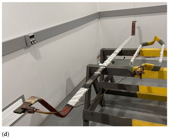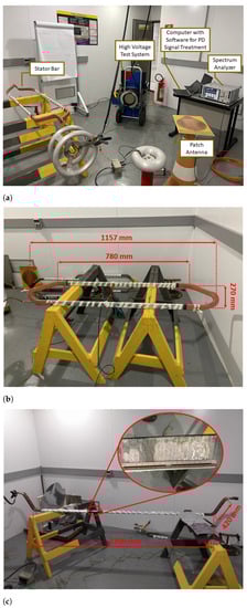 The measurement setup: (a) overview of the measurement setup for acquiring high frequency PD radiated signals, (b) General Electric bar from Curuá-Una hydroelectric power plant (with corona PDs), (c) Jeumont-Schneider bar from Tucuruí hydroelectric power plant (with slot PDs), and (d) parallel-connected bars for producing concurrent corona and slot PDs.