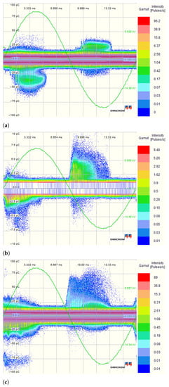 Figure 13 shows PRPDs obtained in this work for the experiments of Figure 12. The measured PRPDs of corona, slot, and the simultaneous corona and slots PDs are shown by Figure 13a–c, respectively. Note that PRPD profiles shown in Figure 13a,b are compatible with standardized PRPD patterns in [6] for corona and slot PDs, respectively, validating our experimental PD sources. By comparing Figure 13a,b, we can see that corona and slot PDs occur practically on the same phase ranges for both the positive and the negative 60 Hz semi-cycles. For this reason, concurrent corona and slot PRPDs overlap each other in Figure 13c, as one would expect. Thus, distinguishing these defects patterns by inspecting solely Figure 13c is a remarkably difficult task.