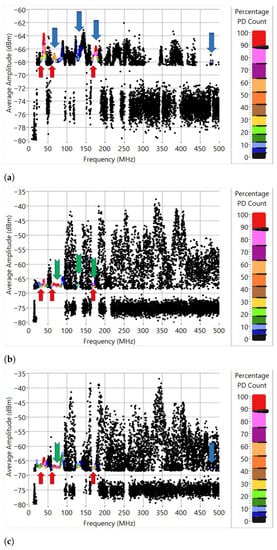 Figure 14c, which was obtained using the measuring setup shown in Figure 12d, shows the simultaneous presence of the corona and slot PDs. Indications are made by following the arrow representations defined above. The low count pulses (black points) are widely spread across the spectrum, indicating the presence of slot discharges in Figure 14c. One may also observe that the spectral regions of high counting pulses corresponding exclusively to corona and slot PDs (around 475 MHz and 75 MHz, respectively), which were previously detected in the measurements shown in Figure 14a,b, are also visible and properly indicated in Figure 14c. Thus, with the proposed methodology, it is possible to identify, undoubtedly, simultaneous slot and corona PDs.