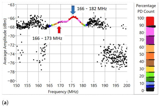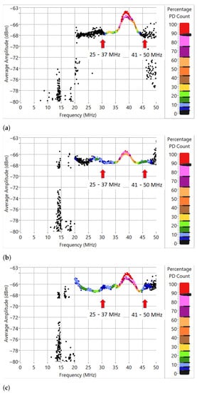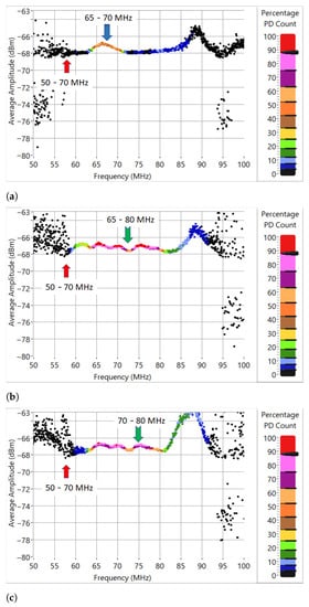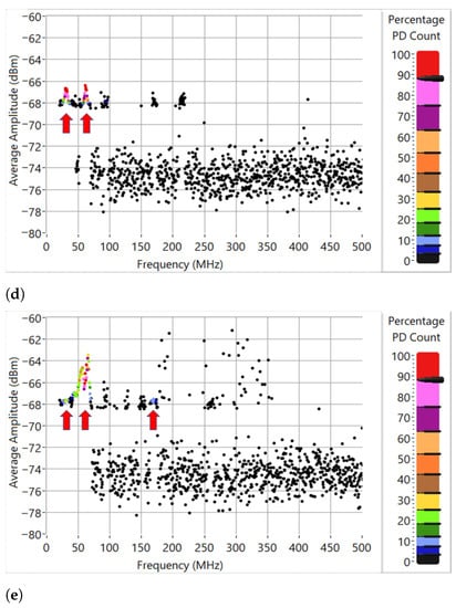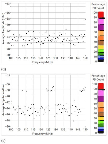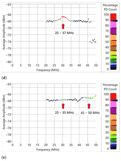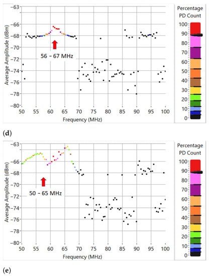 Figure 16 shows FRPD results from 50 to 100 MHz. Figure 16d,e shows noise between 50 and 70 MHz, in such a way that the high voltage source has an important influence on registered counting, with amplitude reaching dBm. Figure 16a shows corona PDs between 65 and 70 MHz, with PD counting up to 63% and amplitudes reaching dBm and low counting registered in noise band (50–70 MHz). Figure 16b shows slot PDs between 65 and 80 MHz, with PD counts up to 100% and amplitudes that reach dBm. In Figure 16b, the noise region indicated by the red arrow has a low count. Figure 16c shows simultaneous corona and slot PDs between 63 and 80 MHz with PD counts up to 100%. The region between 65 and 70 MHz is a region of high PD count shared by corona and slot PDs, as one can see by inspecting Figure 16a,b. The green arrow in Figure 16c highlights the high PD count band, between 70 and 80 MHz, where solely slot PDs occur. The band between 80 and 90 MHz is a communal PD band for both phenomena. Thus, in the FRPD of Figure 16c, corona PDs cannot be identified with confidence, but slot PDs can be clearly seen in Figure 16c.