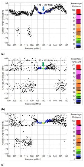 FRPDs obtained from 100 to 150 MHz are shown in Figure 17. High counting noise is not seen in Figure 17d,e. Figure 17a shows corona PDs between 124 and 137 MHz, with PD counts up to 12% and amplitudes that reach −65.5 dBm, as the blue arrow indicates. Slot PDs are seen between 125 and 133 MHz in Figure 17b, with PD counts up to 25% and amplitudes reaching −67 dBm, as the green arrow points out. Figure 17c shows coronas with slot PDs between 125 and 135 MHz with PD counts up to 33%. In this case, since the corona’s and slot’s high counting bands completely intercept each other, it is difficult to distinguish the phenomena by inspecting exclusively the 100–150 MHz band. A very similar situation is seen by inspecting the 150–200 MHz range. As Figure 18a,b show, corona and slot high counting bands are completely superimposed on each other, making discrimination of patterns an intricate process when inspecting Figure 18c.