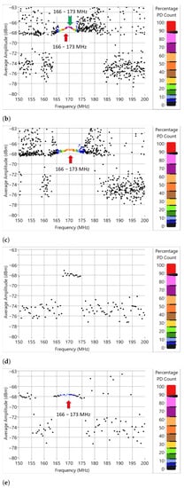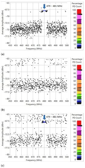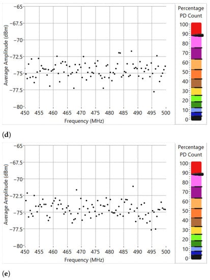 Finally, the FRPDs seen in Figure 19 highlight results from 450 to 500 MHz. Figure 19d,e does not show high counting noise in this sub-band. Figure 19a shows corona PDs between 479 and 481 MHz, with PD counts up to 12% and amplitudes that reach −67 dBm, as the blue arrow pinpoints. Figure 19b shows occurrence of slot PDs with low PD counts in this sub-band, of which power ranges from −68.75 to −65 dBm. Figure 19c shows concurrent corona and slot PDs, in which we can see significant PD counts between 479 and 481 MHz (up to 12%) with amplitudes reaching up −68 dBm, clearly indicating corona PDs. Furthermore, low count discharges with amplitudes ranging between −68.75 and −65 dBm are also seen spread across the frequency band in Figure 19c, suggesting the concurrent influence of slot discharges. Therefore, one can properly identify corona and slot PDs in the 450–500 MHz band by inspecting the FRPD map in Figure 19c.