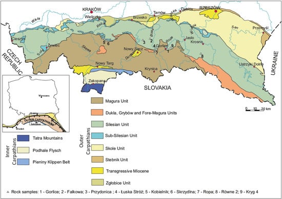 - Żytko, K.; Zając, R.; Gucik, S.; Ryłko, W.; Oszczypko, N.; Garlicka, I.; Nemcok, J.; Elias, M.; Mencik, E.; Stranik, Z. Map of the tectonic elements of the Western Outer Carpathians and their foreland. In Geological Atlas of the Western Outer Carpathians and their Foreland; Poprawa, D., Nemczok, J., Eds.; Państwowy Instytut Geologiczny Warszawa/GUDS Bratysława/Uug: Praha, Czech Republic, 1989. [Google Scholar]