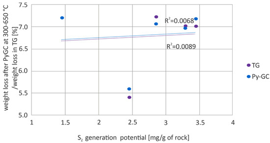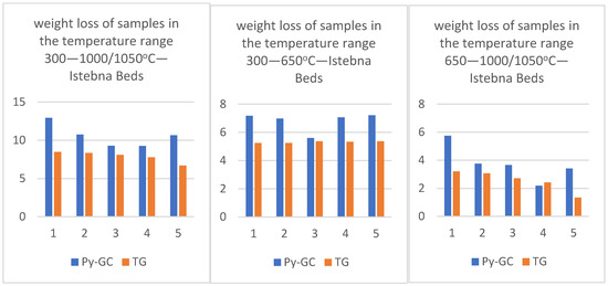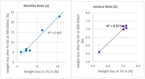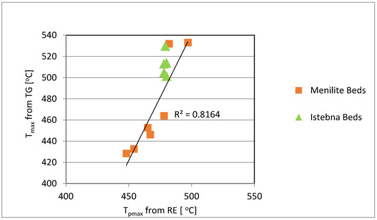 - TG/DTG analysis results indicate a greater variation in the thermal maturity of the Menilite source rocks, where the most active decomposition of organic matter occurred in the wide range of 428–540 °C. In the case of rock samples from the Istebna Beds, the peaks of this decomposition fell between 494 and 530 °C.