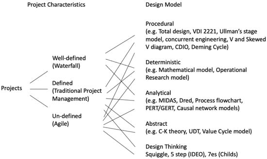 In industry, a dominant process for undertaking a product design action is by means of a project. Projects can be characterized as well-defined, defined, and undefined. Dominant approaches, are commonly adopted for well-defined projects, include waterfall. For defined projects, traditional project management approaches and, for un-defined projects agile management approaches are sometimes used. Design methods, applicable in these projects, can be classified into the following categories: procedural, deterministic, analytical, abstract, and design thinking, and examples of each are provided in Figure 1. Each approach has been subject to extensive study, and hybrids are also possible. A detailed analysis of a given design approach is possible, for example, investigating how the approach addresses different aspects of sustainability. Demonstration of the effectiveness could be made via a series of case studies addressing different applications. However, in the context of this paper, such an undertaking would be a massive research program and is instead suggested as an activity for future work and the wider research community. Here, one approach, represented by the blended design model [36], is considered as this combines principles of project management and procedural design, with recognizable phases from industrial practice, as shown in Figure 2.