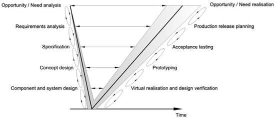 The blended design process [36] comprises phases of opportunity analysis, requirement analysis, specification, concept design, system analysis, prototyping, testing, production planning, and opportunity realization. The phases follow an adapted timeline from the classic V model [37], but this is skewed to take account of the increased resources associated with some activities. Each phase of the blended design process is connected to a corresponding phase to indicate and prompt consideration of the relevant aspects, be it from the initial design activity or detailed planning. The phases are also connected to adjacent phases to prompt and indicate iteration with flows back and forth of information and revisiting of ideas and decisions as new information emerges. Typical design processes do not explicitly define sustainability as a principal activity or function in different stages. Instead, the classifications used with the model description are broad and generic. This could be viewed as a benefit or a risk, depending on whether the individual designer or company concerned is willing or able to apply considerations of sustainability and the associated tools and significant resources available. For example, in requirements analysis, the need for a product, service, or system to perform to a prescribed level of sustainability could be recognized and addressed. In specifications, these levels can then be qualified and quantified as appropriate, for example, ensuring compliance with relevant national and international standards. In conceptual design, ideas can be judged against whether they comply with various sustainability measures, defined and in testing, which is the corresponding phase with specification.