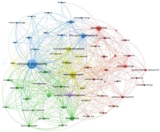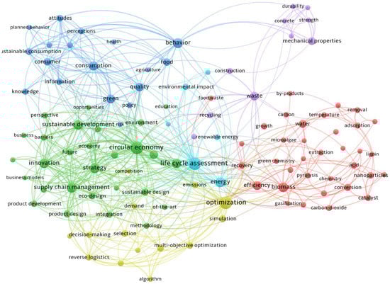 Co-occurrence analysis of author keywords for the retrieved results was carried out and visualized using VOSViewer [44], as shown in Figure 3. The size of the label reflects the number of occurrences. The distance between labels refers to their relatedness regarding co-occurrence; in other words, the closer the two labels are, the more likely they are to appear together in an article. The network map suggests six research focuses of sustainable product design, including circular economy (left green cluster), life cycle assessment (central cyan cluster), biomass (right red cluster), optimization (bottom yellow cluster), waste management (top right purple cluster), and quality and consumption management (top blue cluster).