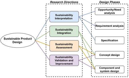 In the review of contemporary sustainable product design research, two series of bibliometric and author keywords analysis were carried out in this article using “sustainable product design” and five separate searches, combining generic design phases and derived key words. Results from both analyses suggest that popular trends in recent research in sustainable product design include circular economy, life cycle assessment, sustainability development and management, and product optimization. Product design aspects are considered by the researchers, but they are failing to make their work searchable due to the keywords used in sustainability research, which so not correspond with what designers would look for. In other words, designers lack access to relevant sustainability research to make products more sustainable. This leads to the problem that the design process proceeds with a divorce process between design intent and design reality. For example, sustainability consideration and evaluation are often conducted separately as a life cycle assessment (LCA) at the end of the product development process. This may not be the intent of proponents of LCA studies and the circular economy but can nevertheless occur as a result of practitioners failing to notice a study or not following the defined strictures associated with a methodology. As mentioned earlier, decisions made at design stages have a significant impact on sustainability later. This raises the question of how sustainability can be emphasized throughout the design process. There is research that correlates sustainability with one or more product design phases, which is summarized by the skewed V diagram. Table 5 presents a list of example articles from the retrieved results, with limitations and future directions indicated. Based on the findings, the authors summarize four future directions of sustainability research in the context of product design, as shown in Figure 6.