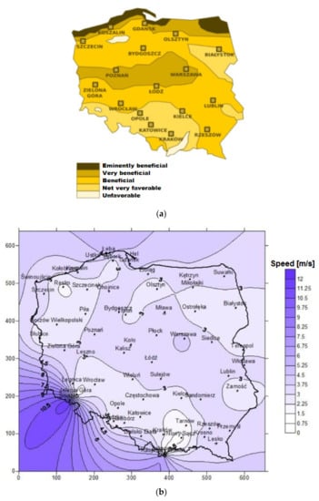 (a) Wind conditions in Poland. Source: https://www.instalacjebudowlane.pl/7935-24-87-elektrownie-wiatrowe--wietrznosc-w-polsce.html (accessed on 8 October 2021). (b) Wind speeds in Poland. Source: https://remont.biz.pl/energia-odnawialna/zasoby-energii-wiatru-na-terenie-polski-mapa-lokalizacji-w-ktorych-wykorzystamy-wiatrak-do-produkcji-energii-elektrycznej/?fbclid=IwAR2FDyApg_9f3H8blMmpTi_x_BSXgOk7deX5ItihZSu14Vk1_Kzw4PYKLCk (accessed on 8 October 2021).