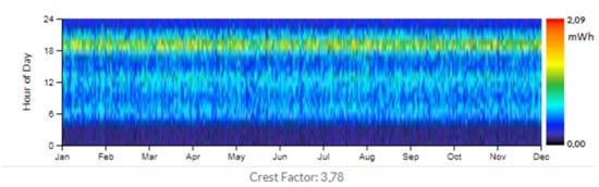 Due to the location of the Lubuskie Voivodeship in two different wind zones (Figure 1), the question arises about the possibility of supplying energy to households located in separate zones. The analysis of two geographically different locations, in terms of energy production, was widely discussed. The approach used by Becerra et al. [] for example, Chile, aimed to identify the economic benefits of wind and solar energy. In turn, the study by Chang and Starcher [] concerned the identification of the right location for investment in wind and solar energy in Texas. Such analyses show the possibilities of using wind energy to supply a household with electricity by installing wind turbines as an alternative to photovoltaic panels or as a supplement to meet the demand for electricity. The pattern of electricity consumption for the Lubuskie Voivodeship is shown in Figure 2. The annual energy consumption model can be considered sustainable, and the highest energy consumption oscillates between 6:00 p.m. and 9:00 p.m. (Figure 2), which is mainly related to the performance of contract work at earlier times and the activity of household members in the household. This mainly applies to administrative staff, as well as points of sale, repair shops, banks, and other qualified professions. After this time, increased energy consumption occurs due to the operation of many household appliances for hygienic, entertainment, recreational, or professional purposes. At other times, the statistical consumption is lower and often refers only to the provision of energy to devices that constantly require energy supplies (such as pumps). As a rule, people with free time distribute household chores over a longer period of time, so energy consumption is more evenly distributed over time. The lowest consumption falls on the night hours, due to the lifestyle, work, and rest.