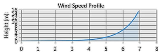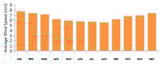 Recorded wind speeds change cyclically—from faster ones in cool periods to slow ones in summer (Figure 3). The level of urbanization is also an important factor. Open areas are a significant determinant for the use of wind potential, which is difficult to implement in dense urban developments. The wind profile of the Lubuskie Voivodeship is shown in Figure 4. This picture shows the existence of clear differences between individual months, the capacity of wind farms to produce electricity, and the need to use other energy sources to ensure the stability of supplies.