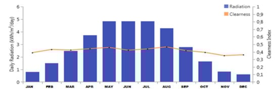 For the northern and southern parts of the Lubuskie Voivodeship, the average radiation values are 2.78 kWh/m2 and 2.76 kWh/m2, respectively. The clearness index, expressing the relation of global solar radiation intensity measured at ground level to its equivalent estimated at the top of the atmosphere [], in both cases, was very similar, and its fluctuations over the year are small. The greatest potential for generating energy from the Sun occurs in the summer (Figure 7). As the best time periods for the production of energy from wind and sun are in opposition to each other, it is worth using a combination of their use in order to maximize the production of electricity. This is a clear indication for the hybrid model when planning wind investments.