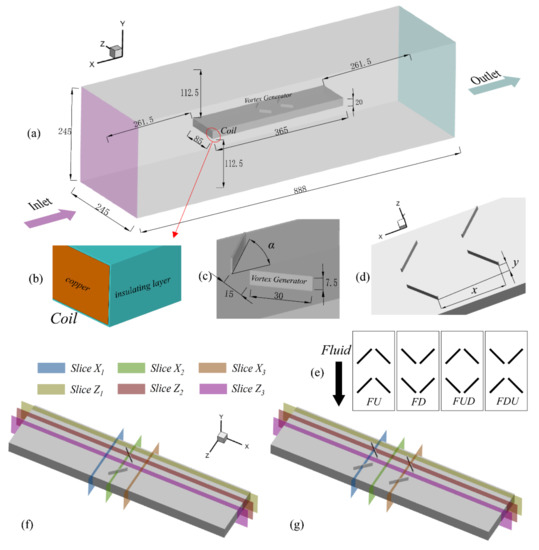 Figure 1c shows the detailed data of the vortex generator. The length and width of vortex generators are 30 , 1 respectively, while the height, which is defined as , of the vortex generator, is 7.5 . Furthermore, the attack angle of the vortex generator is defined as , and the distance between each pair of wings is 15 . As presented in Figure 1d, when investigating the best arrangement of the vortex generator, the longitudinal distance between two adjacent vortex generators is , while the transverse distance is defined as . Additionally, besides the variety of the longitudinal and transverse distance, four different vortex generator distribution modes are shown in Figure 1e, which are specified as Flow-Up (FU), Flow-Down (FD), Flow-Up-Down (FUD), Flow-Down-UP (FDU). It is worth noting that when investigating the influence of vortex generator arrangement on heat transfer performance, this paper first explores and four different distribution modes to obtain a better longitudinal distance and distribution mode. On this basis, are discussed to explore the influence of the transverse distance of vortex generator on heat transfer. Based on the above results, a relatively better heat transfer arrangement can be obtained.