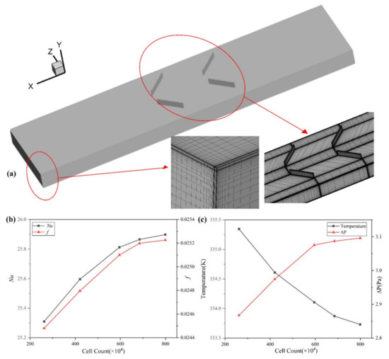 As illustrated in Figure 2a, all models calculated in this paper use hexahedral mesh. When figuring out the grid near the wall, it is necessary to take the thickness of the boundary layer into account, thus the use of the dimensionless number Y plus is required for characterization [33]. When calculating the grid spacing of the first layer, Y plus = 1 is taken to obtain the grid spacing of the first layer. After the grid spacing of the first layer is determined as 0.02 mm, it is extended outward in the proportion of 1.1 ratio. Before the numerical simulation, the grid independence is analyzed with five grid numbers, i.e., , , , , and . From Figure 2b, it can be observed that with the increase of the number of grids, the growth of and gradually decreases. Besides, it can be seen from Figure 2c that the maximum temperature of copper wire decreases and the increases with the increase in grid number. When the number of grids is greater than , the , , maximum temperature, change little, and when the number of grids changes from to , the relative change rates are less than 0.3%. Therefore, considering the accuracy and calculation time, a grid number of is adopted in the present study.