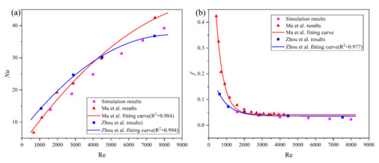 Since the numerical model of the smooth channel proposed in this paper is similar to the physical models presented by Ma et al. [34] and Zhou et al. [14], the , of the numerical model and the experimental model are compared to verify the reliability of the numerical model. As is found in Figure 3a, the Nusselt numbers are in reasonable conformity with two correlations from Ma et al. and Zhou et al., with average deviations of 9.5% and 10.8%, respectively. Similarly, according to Figure 3b, the friction factors of the simulation results are in reasonable agreement with Ma and Zhou’s results, with average differences of 26.9% and 16.9%, separately. Therefore, it is credible that the numerical model and solution method in this study are reliable.