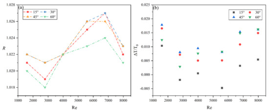 Four different attack angles of vortex generators are used to explore the best choice, the four models differ only in the attack angle, and the other control conditions are consistent. By comparing the performance of the of vortex generator under four different attack angles of , , , and , a better attack angle can be obtained. Figure 4a shows the change of the of vortex generators with different attack angles in the process of increasing. It can be seen that the is very close when the attack angles are and , and both of them are better than and attack angles, which is similar to the law obtained by Lotfi et al. [35] and Gholami et al. [36] when studying the attack angles of vortex generators in the past. Considering that the maximum temperature has a greater impact on oil-cooled motors, when the of different types have the same performance, the vortex generator with a lower maximum temperature is used for calculation and discussion. In order to more widely explore the effect of the vortex generator on the coil end heat transfer, we introduce the thermal enhancement factor , where represents the difference between the maximum temperature of the channel with vortex generator and the maximum temperature of the channel without vortex generator, and represents the maximum temperature of the channel without vortex generator. As presented in Figure 4b, the thermal enhancement factor of the attack angle is higher than that of the attack angle. Therefore, the attack angle vortex generator is selected as the basis for subsequent exploration.