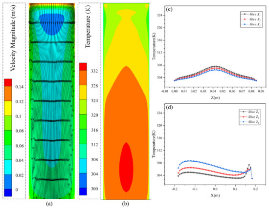 Diagrams of FU- under steady state conditions: (a) streamline diagram, (b) temperature contour diagram, (c) slice temperature diagram in direction, (d) slice temperature diagram in direction.