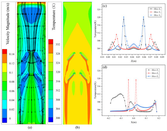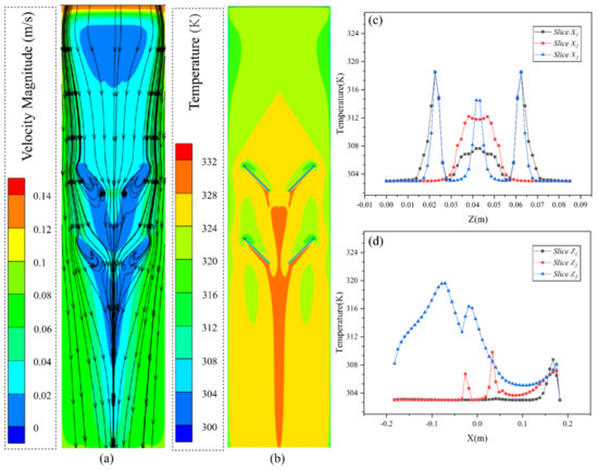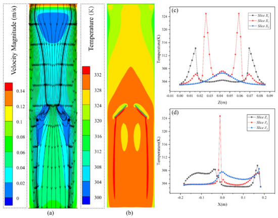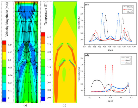 Diagrams of FD- under steady state conditions: (a) streamline diagram, (b) temperature contour diagram, (c) slice temperature diagram in direction, (d) slice temperature diagram in direction.