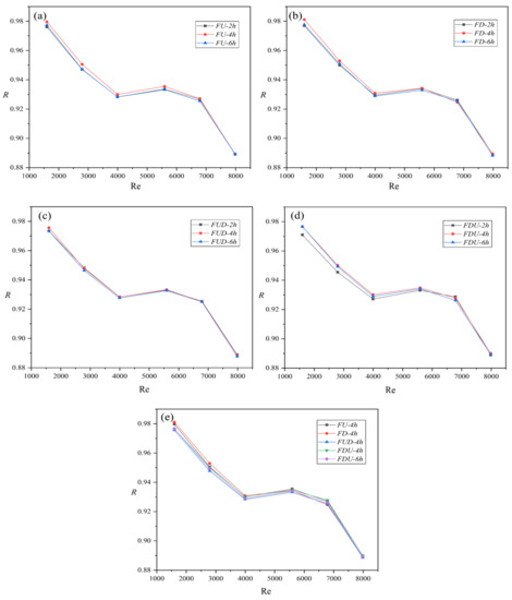 After selecting as the better attack angle of the vortex generator, the best longitudinal distance and distribution mode are explored. In this part, two winglets of the vortex generator are symmetrically distributed, with a total of 12 different cases. Figure 7a–d shows the variation of the of vortex generators with FU, FD, FUD, and FDU distribution modes at different longitudinal distances at different . Through comparing the performance of the , it can be concluded that in the three distributions of FU, FD, and FUD, the performance of longitudinal distance of is better than that of and . Especially in the two cases of FU and FD, the performance of the longitudinal distance of is significantly better than that of and at small . However, in the case of FDU distribution, the performance of longitudinal distance of is similar to that of . Therefore, as shown in Figure 7e, comparing the five cases of FU-, FD-, FUD-, FDU-, and FDU-, the conclusion that when the is less than 4000, the comprehensive performance of FD- is the best, while when the is greater than 4000, FU- has a slight advantage over other cases can be summarized. Besides, according to Figure 8, it can be concluded that the thermal enhancement factor of FD- performs more prominent when the < 4000, while the FU- tends to be better when the > 4000, and the overall thermal performance can be improved by up to 10.2%.