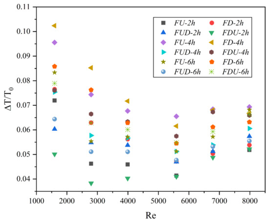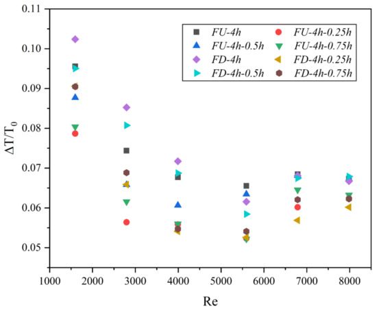 - Through the numerical simulation of the transverse distance of FU- and FD-, it can be concluded that, when the Reynolds number is less than 4000, the enhanced heat transfer performance of FD- is extraordinary, and when the Reynolds number is greater than 4000, the improved heat transfer performance of FU with a longitudinal distance of 4 h and transverse distance of 0.5 h (FU-) is better.