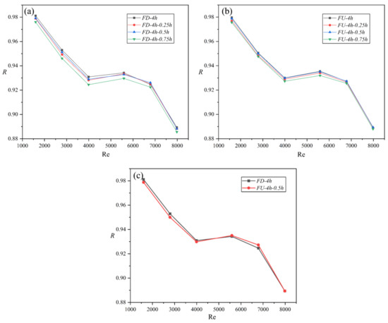 Through the above research results, eight transverse distributions are explored based on FD- and FU-. Figure 11a,b illustrates the change of the of FD- and FU- with different transverse distances under different . According to Figure 11a, compared with other transverse distances, FD- without transverse distance still performs best, while in Figure 11b, FU-- has slight advantages. Therefore, as shown in Figure 11c, by comparing FD- and FU--, the results can be conducted that when the is less than 4000, the comprehensive performance of FD- is better, while when the is greater than 4000, the effect of FU-- is better than other situations. Furthermore, from Figure 12, the conclusion that when the < 4000, the thermal enhancement factor of FD- still performs better, while when the > 4000, the FU-- tends to have some gradual preponderance.