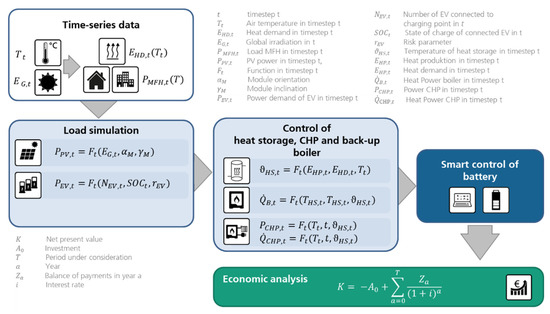 Overview of the developed simulation model of decentralised energy systems. Based on time-series data in minute resolution (upper part), the power output of PV is simulated as well as EV charging. The control of CHP, heat storage and back-up boiler is modelled as a simple heuristic (central part). Smart control of battery and charging infrastructure can be simulated with different objectives (right part). The simulation results are an input for the subsequent economic analysis (lower part).