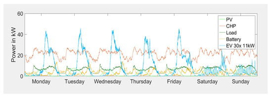 Figure 3 shows the load simulation results for scenario S4 (see Table 2) in the form of average day profiles from Monday to Sunday. The figure illustrates the importance of the EV charging profiles: with their high electricity consumption, EVs cause the highest load peaks with over 40 kW on Fridays. Moreover, the electricity consumption varies between weekdays and in particular between weekdays and weekend days, when the commuting trip is not necessary. The figure further displays the battery charging. With the self-consumption maximising operation strategy, charging mostly occurs in late evening hours when excessive CHP power is produced.