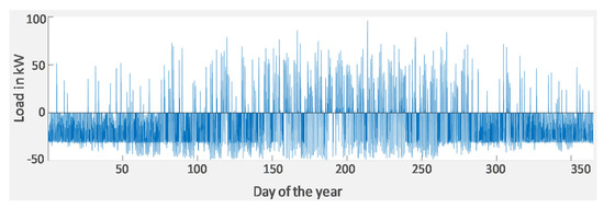 The resulting power exchange with the public grid is depicted in Figure 4. Over the year, the different characteristics of the CHP and PV power plants become apparent: the cold season is dominated by excess electricity production of the CHP that is operated with a heat-controlled strategy. The summer season shows dynamic fluctuations between times with high CHP and PV overproduction and EV charging events that cannot be supplied solely with self-produced power and power from the battery storage.