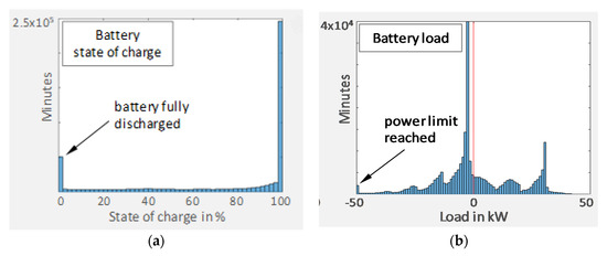Over the course of the year, 210 MWh of electricity is produced onsite with PV and CHP from which 115 MWh are self-consumed, resulting in a self-consumption ratio of 55%. With an onsite electricity demand of 127 MWh, however, the self-sufficiency ratio amounts to 91% and the target of zero-energy consumption is missed. The reason is that the mismatch between electricity demand and production, in particular the peak demand of EV charging, cannot be resolved with the installed battery. Figure 5a depicts the state-of-charge over the simulated year in a histogram. We calculated with the usable capacity at this point and therefore set the SOC limits to 0% and 100%. It shows that for most times during the year, the battery was fully charged. However, in extended periods of time, the battery was empty and could thus not supply the electricity demand. We calculated 395 events in which the battery was empty, which is more than once a day. Emergency charging from the grid during off-peak periods could prevent the battery from being completely discharged. Furthermore, the battery power is not sufficient to supply the EV charging infrastructure in peak times. Figure 5b illustrates the battery loads and shows that the battery reached its discharging power limits.