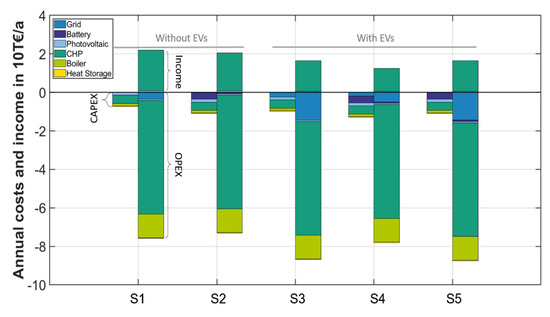 Overview of investment costs (CapEx), operating costs (OpEx) and incomes of the four system scenarios without electric vehicles (S1–S2) and with 30 electric vehicles (S3–S5).