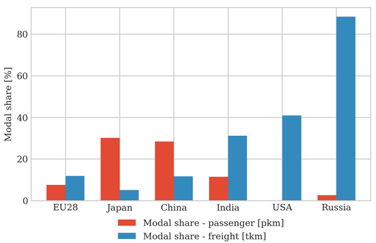 In addition, the European railway area is divided by numerous national borders, which, given the diversity of infrastructure in terms of power supply to the catenary network as well as signaling and safety systems, and in some cases the rail gauge, generates additional constraints on railway traffic in Europe [53]. Comparing Europe, based on data published by UIC, to other regions where rail plays a significant role in the transport system [50], some interesting conclusions can be drawn. The modal share of rail is relatively small in Europe. It amounts to 8% for passenger transport and 12% for freight transport. As can be seen in Figure 2, the modal share of freight rail transport in the Russian Federation is as high as 88%, and the modal share of passenger transport in Japan is 30%. On the other hand, in the USA, the modal share of railway for passenger transport is less than 1%.