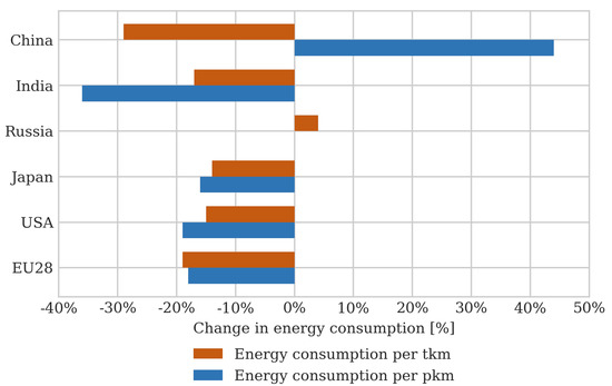 Change of unit energy consumption in the rail industry in selected regions in 2015 vs. 2005. Own study based on data from [47].