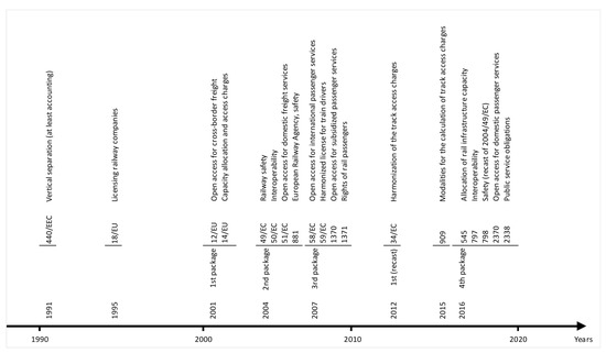 The Directive on Railway Vertical Separation was issued in 1991 [66]. The first railway package, announced in 2001, gave guidelines for the allocation of railway network capacity and charges for access [67]. Since then, rail market reforms have been successively implemented in the member states, and successive packages have introduced detailed regulations for rail transport in Europe, as shown in Figure 5 below [68,69].