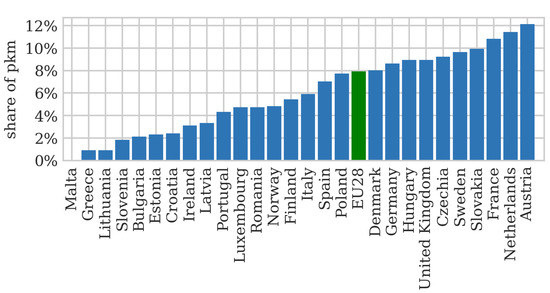 The railway network in Poland, according to the Office of Railway Transport (UTK), which acts as the regulator in the country, had a length of 18,934 km in 2019, 61% of which are electrified lines [74]. After Germany and France, Poland thus has the third largest rail network in Europe. The network density in Poland according to UTK data reaches the value of 62 km per thousand square kilometers. According to Eurostat data, the modal share of rail in Poland for passenger transport in 2017 was 7.7%. As Figure 6 below shows, this share places the Polish railway at a level close to the European average, which for the EU28 countries was 8% [75].