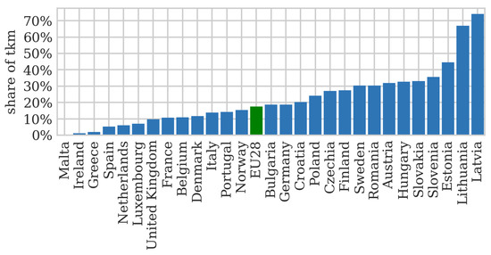 Modal share of railway transportation in freight transport for selected European countries in 2017. Own study based on data from [76].