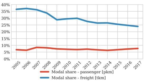 Dynamics of modal share of railway transportation in Poland. Own study based on data from [75,76].
