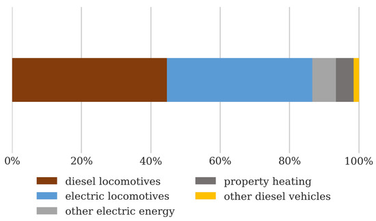After the political reform and market liberalization in Poland in the 1990s, interest in the concept of sustainable development and related corporate social responsibility emerged among Polish enterprises [79]. DB Cargo Polska is a company which declares its orientation towards sustainable development. Therefore, the optimization of energy consumption fits well with the company’s strategy to ensure the achievement of both economic and environmental objectives. The area of the railway company’s activity in which energy consumption is the highest is, of course, transport operation. The company uses both electric and diesel locomotives for this purpose for transport on non-electrified railway lines. Diesel shunting locomotives are used for first-mile and last-mile operations associated with sidings and terminals. Another area where the company consumes a relatively large amount of energy is rolling stock maintenance. For this purpose, the company uses repair facilities, which consume thermal and electrical energy. The remaining marginal part of energy consumed by the company is related to its administrative activities.