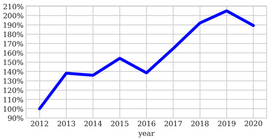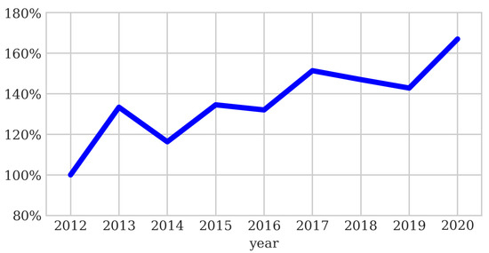 The break in the positive trend in 2020, shown in Figure 10, is due to the economic collapse caused by the COVID-19 pandemic. The company improved its energy efficiency, measured as the ratio of transport work to the total energy consumption of the company, by more than 20% between 2012 and 2020. The additional output produced by using this energy is not easy to operationalize, due to the variety of ancillary services sold. However, it has been assumed that the measure of this output will be the value of revenues generated by the company from services that do not constitute rail transport. The graph below shows the dynamics of the company’s revenue from services that do not generate freight work.