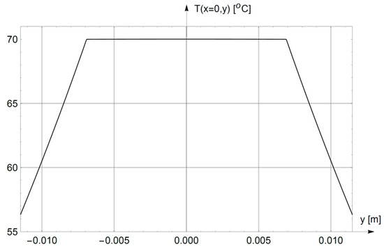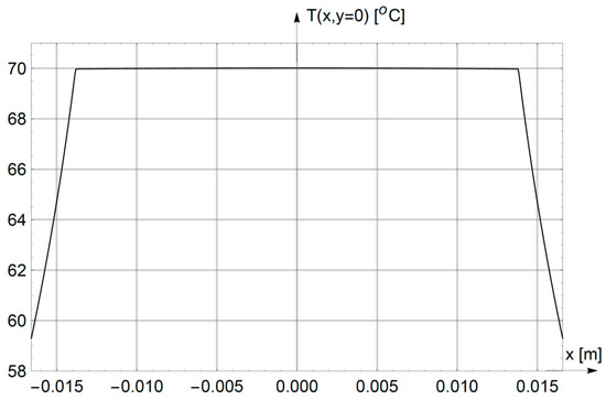 Equation (31) was solved iteratively in the Mathematica 11.1 program [26]. For the data from the set in (30), the result Icr = 574.5 A was obtained. Then, for this current, the thermal field in the elliptic conductor was determined. For more convenient observation, the selected distributions are presented in the Cartesian coordinate system x = c∙coshη∙cosψ, y = c∙sinhη∙sinψ. Figure 2 and Figure 3 illustrate temperature changes on the major axis (y = 0, Figure 2) and on the minor axis (x = 0, Figure 3), respectively. Figure 4, in turn, shows the two-dimensional distribution of the temperature field on the conductor cross-section with the current provided above.