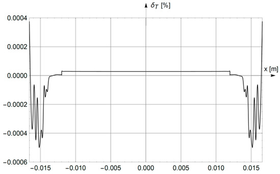 where is the temperature increase distribution obtained using the AN (analytical–numerical) method in the i-th zone, while represents th temperature increase distribution calculated using the FE method in the i-th zone. Figure 5 and Figure 6 illustrate the relationship in Equation (32) on the major axis (y = 0, Figure 5) and on the minor axis (x = 0, Figure 6) of the ellipses, respectively. At points not located on the axes (x ≠ 0 and y ≠ 0), the relative differences of Equation (32) are similar to those shown in Figure 5 and Figure 6.