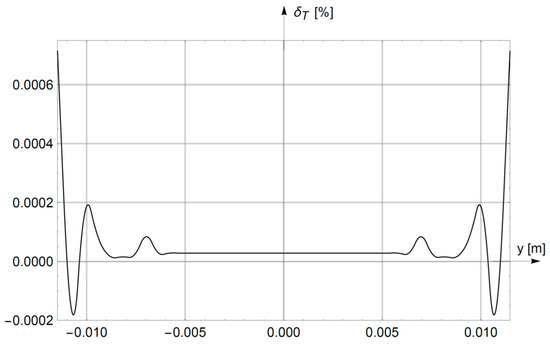 - The relative differences between the temperature distributions in Equation (32) (calculated using the analytical–numerical (AN) method and the finite-element (FE) method) are very small. On the major axis y = 0, the module (32) is smaller than 0.0005% (Figure 5), while on the minor axis x = 0, |δT2| < 0.00075% is true (Figure 6). The smallest differences in Equation (32) are found in the region of uniform field (i.e., in the core). Slightly greater deviations δT2 are observed in the area of temperature drop (i.e., in the insulation); this results from the inequality λ1 >> λ2. Due to the small values of relative differences in Equation (32), the developed AN method leads to practically the same results as the commonly used numerical FE method.