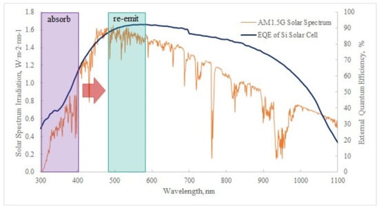 - Day, J.; Senthilarasu, S.; Mallick, T.K. Improving spectral modification for applications in solar cells: A review. Renew. Energy 2019, 132, 186–205. [Google Scholar] [CrossRef]