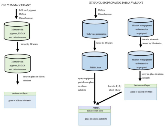 In two last variants, the layers were deposited by spray-coating method using hand airbrush. In all options, the PMMA concentration in the base mixture was 2%. In the first variant, the luminescent material, PMMA and solvent (chlorobenzene) were weighted. The layers were prepared in seven various concentrations of pigments: 1%, 2% 5%, 10%, 15%, 20%, and 50%. Subsequently, the mixtures were stirred with a magnetic stirrer for 24 h under hermetic cover. In two other options, ethanol and isopropanol variants, only the PMMA (base) was prepared in the same way. Pigments were added in four quantity variants: 0.1 g, 0.2 g, 0.5 g, and 1 g and then flooded with 30 mL of ethanol or isopropanol. After that, alcohol (ethanol or isopropanol) with pigments was put in an ultrasonic cleaner for 30 min in order to disperse the pigment evenly in the alcohol volume. Subsequently, the mixtures were deposited by spray-coating method on glass substrate (for optical transmittance measurements and external quantum efficiency (EQE) measurements) as well as silicon substrate (for scanning electron microscopy (SEM) and optical microscopy measurements). In the first option, where pigments were incorporated in PMMA matrix, the layers were deposited and dried at room conditions for 24 h. In the second and third variant, the layers were deposited and left for an hour to let the alcohol evaporate (ethanol or isopropanol, respectively). Afterwards, the pigments were covered by PMMA matrixes as protection layers. Thereafter, the layers were drying in room conditions for 24 h. Finally, the layers and silicon solar cells without and with layers were characterized. The schematic of the processes is presented in Figure 2.