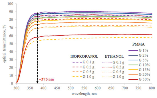 The optical transmittance characteristic of layers prepared with spray-coating method based on G pigment in all three variants.