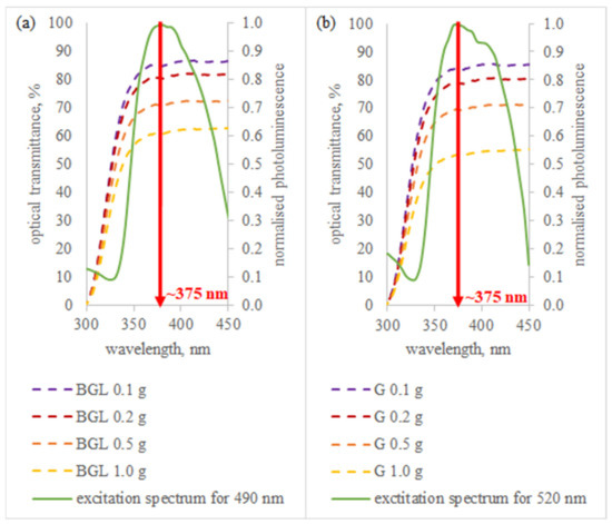 The optical transmittance characteristic of layers prepared with spray-coating method based on BGL (a) and G (b) pigments in isopropanol variant and the excitation spectrum of BGL (a) and G (b).