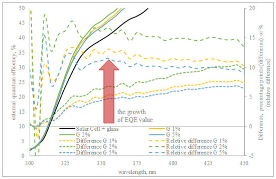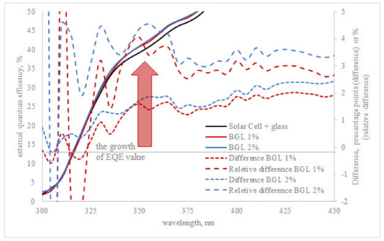 Thus, to confirm these assumptions, at first, the external quantum efficiency (EQE) of polycrystalline silicon solar cells without and with DS layers were characterized. The results for BGL and G pigments are gathered in Table 1 and Table 2, respectively, where for a given wavelength, a difference of EQE for a polycrystalline silicon solar cell with and without the DS layer is shown. The results show that the layers in the ethanol variant have not increased the EQE characteristic for UV range; however, the layers deposited in isopropanol or PMMA variants are promising in some variants. The value of EQE increased relatively by almost 3.2% for the 0.2 g isopropanol variant and more than 4.5% for only the PMMA variant of BGL pigment. The G pigments fared even better in this comparison. The value of EQE was increased relatively more than 8.7 % for the 0.5 g isopropanol variant and more than 16.7% for only the PMMA variant. In Figure 6 and Figure 7, the best improvements of EQE for BGL and G pigment, respectively, in the UV range are highlighted.