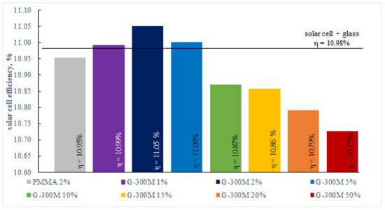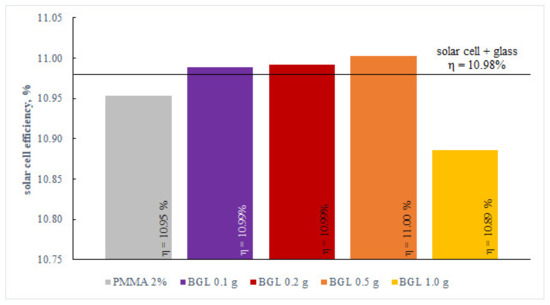 The next step of analysis is research on possible improvement of solar cell efficiency. Results of I-V characteristics measurements in standard test conditions (STC) show that there is a small growth of efficiency in some cases (marked in red in Table 3 and Table 4). The main parameters of these measurements for pigment BGL and G are presented in Table 3 and Table 4, respectively. Evidently, for BGL pigment, there is a slight improvement of efficiency, which increased from 10.98% to 11.00% for layers containing 0.5 g of powder in the isopropanol variant, as well as in the PMMA variant for 2% concentration from 10.98% to 10.99%. Pigment G benefits in this comparison, where for the isopropanol variant, an efficiency of 11.01% for 0.2 g and 0.5 g is achieved. The best results were obtained for layers based on G pigment in only the PMMA solution method, where the concentration of pigment was 2%. The efficiency growth up to 11.05% was observed in this case. In Figure 8 and Figure 9, the comparison of efficiencies for BGL and G pigments, respectively, are summarised.
