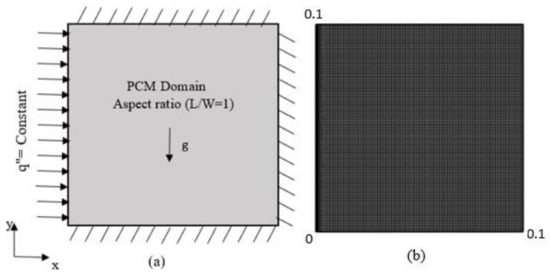 A rectangular configuration has been picked as the physical domain due to its numerous applications in energy storage, casting, etc. The computational domain can be considered as the 2D representation of the physical domain as it has a unit thickness normal to the plane of paper. A plane of symmetry is considered in the z-direction, neglecting all possible 3D effects. Figure 1a,b can be depicted as the 2D computational domain and discretized domain, respectively. The physical domain is subjected to isoflux on the left boundary with insulated boundary conditions on other surfaces. The thermophysical properties of silicon and NaNO3 used in the analysis are presented in Table 1.