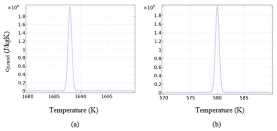 The effective heat capacity formulation modifies the overall specific heat (cp, mod) of the PCM to consider the heat of fusion/solidification needed for a phase change in the PCM. The modified specific heat for NaNO3 and silicon are represented in Figure 2, which indicates a sudden change during the phase change transition interval. Similarly, other thermo-physical properties such as kmod, dynamic viscosity, and ρmod are introduced as a function of temperature. The modified properties are eventually introduced into the energy conservation equation.